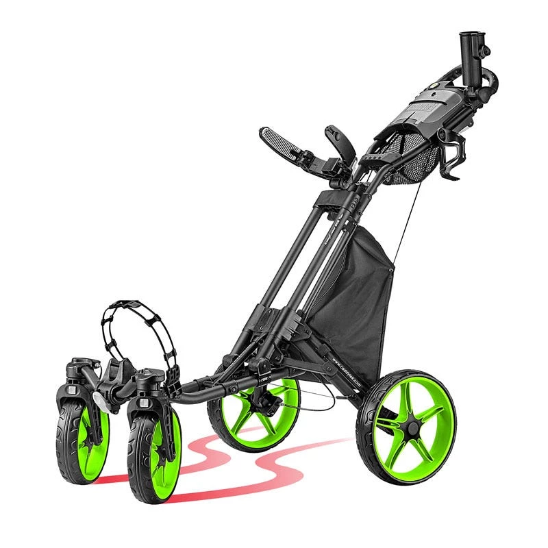 The unique one-click folding 4 wheel golf cart mastered by CaddyTek now comes with not only the easy to use hand-brake, but also with Swivel Front Wheel with locking mechanism. Golfers can switch between swivel or straight mode by toggling the lever on the handle and move on or off the golf course with ease and swiftly. Rain or shine, cart your clubs around the green in style. Enjoy the game with CaddyTek!