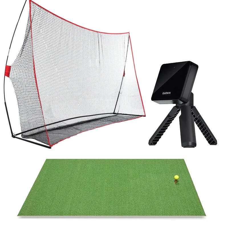The package includes: Garmin Approach R10, OneSwing Driving Golf Net & Golf Mat 90×150 cm