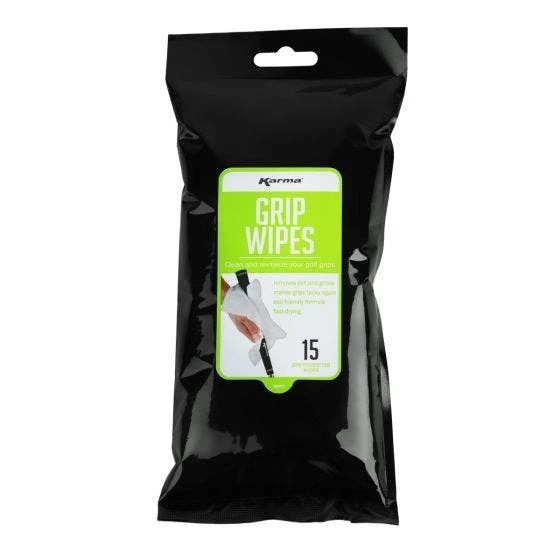 Karma Golf Grip Cleaning Wipes are a convenient, fast and effortless way to clean your grips of dirt and grime and makes your grips tacky once again. The Karma Golf Grip Cleaning Wipes come in a resealable 15-count package that easily fit inside your bag. The fast-drying formula goes to work to minutes. Finally, no more mixing soap and water and then waiting hours for the grips to dry the old-fashioned way. Let Karma Grip Wipes give you peace of mind and no more loss of valuable strokes due to slick grips.